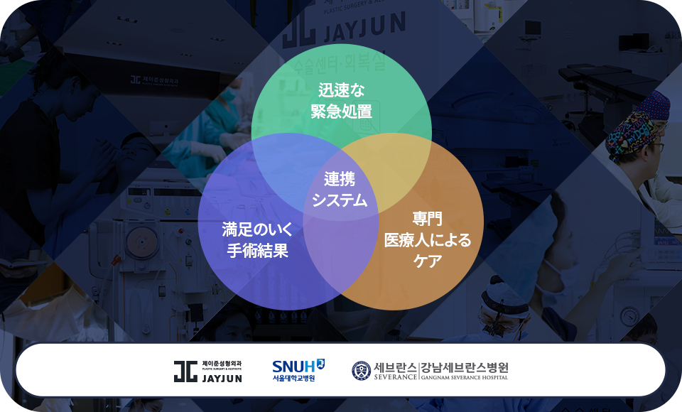 JAYJUN美容外科では緊急時に備えソウル大学病院、江南セブランス病院と実施がん協力治療システムを構えています。